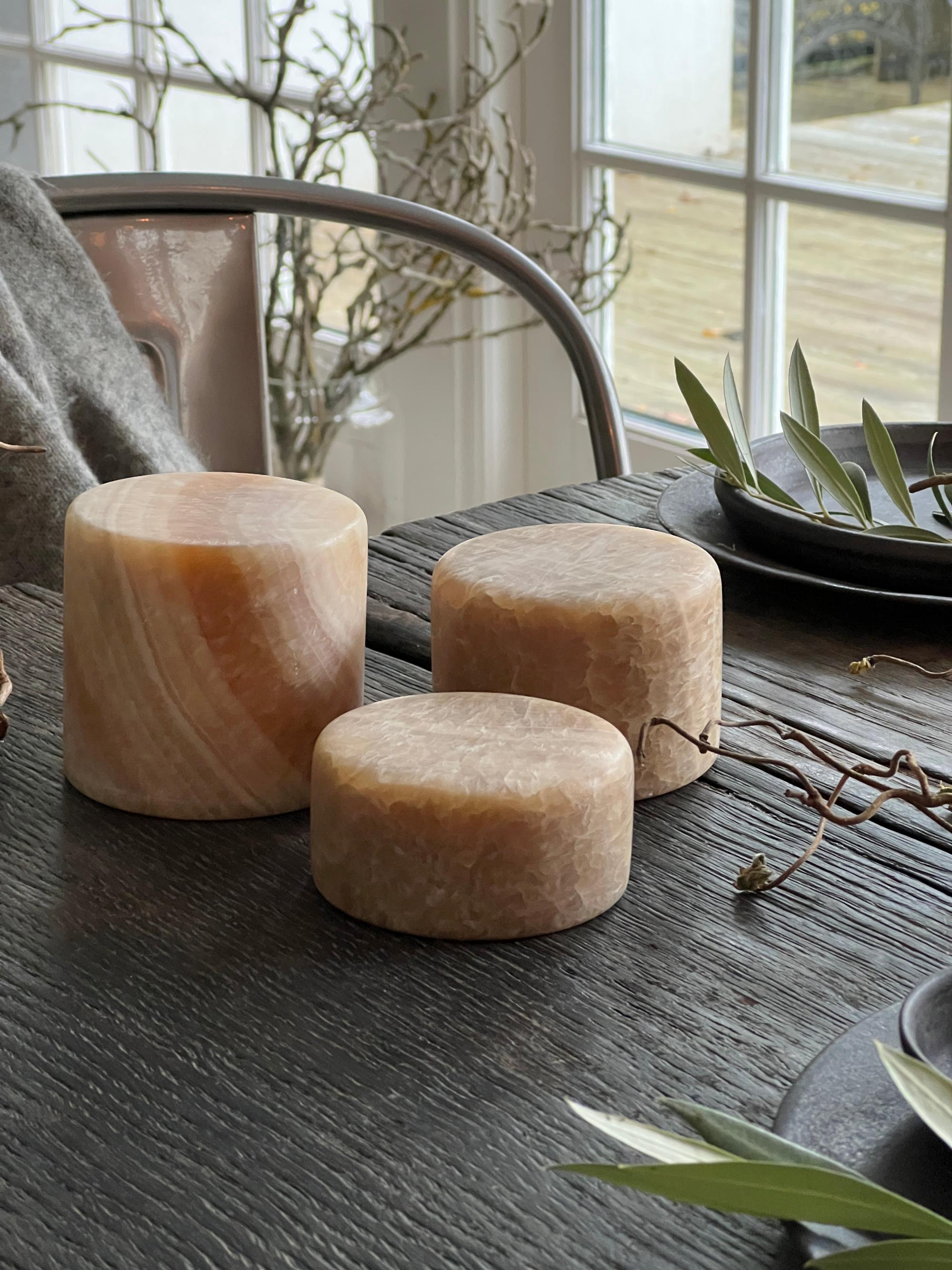 Der findes flere varianter og farver, så du kan blande efter stil og stemning. Marmorlysene findes i både matte og blanke udgaver, og der findes desuden bordlys i jade – en ædelsten med smukke grønne nuancer.