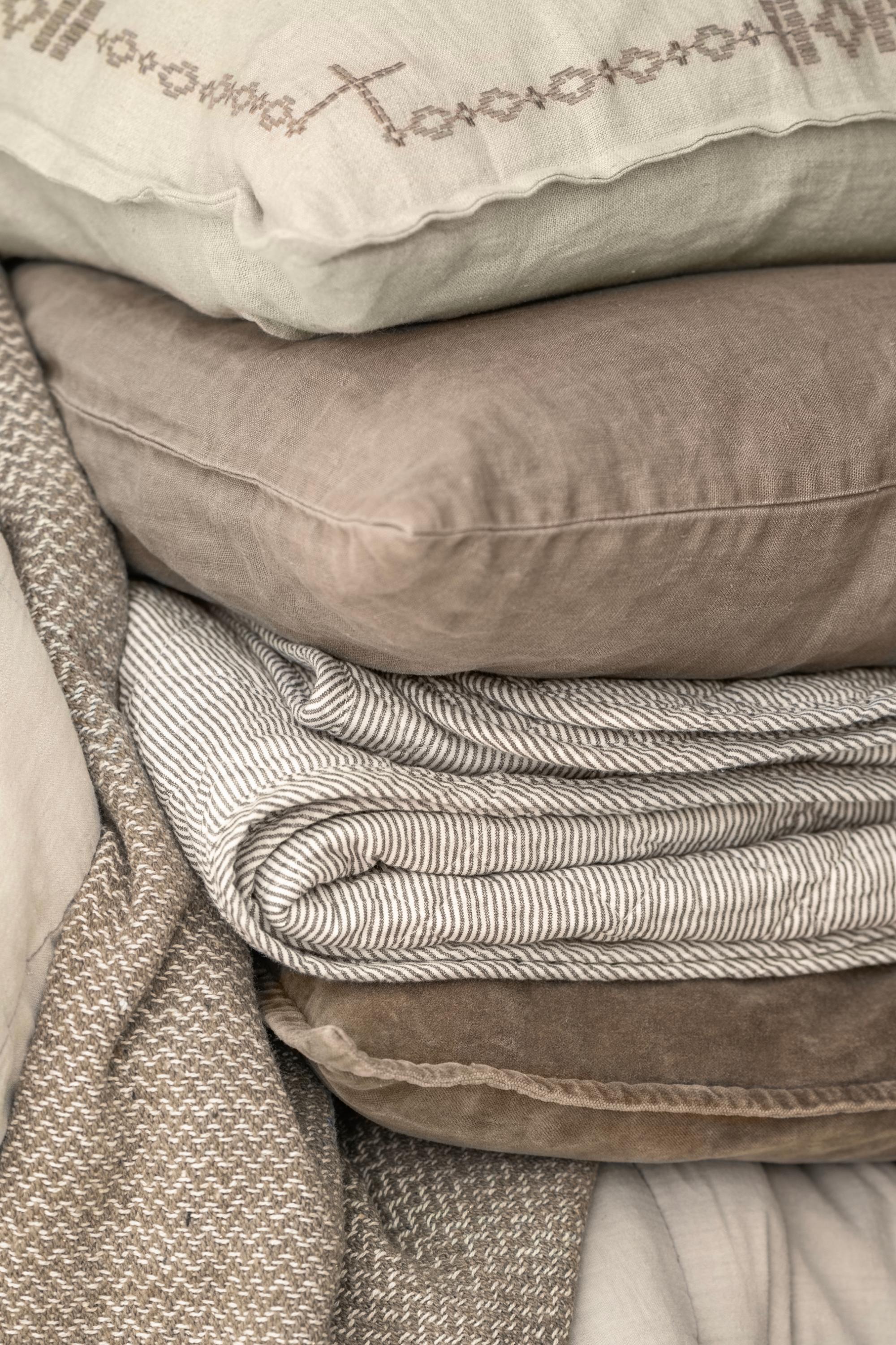 Quilt i bomuld med hvide og jordfarvede mælkedrengestriber