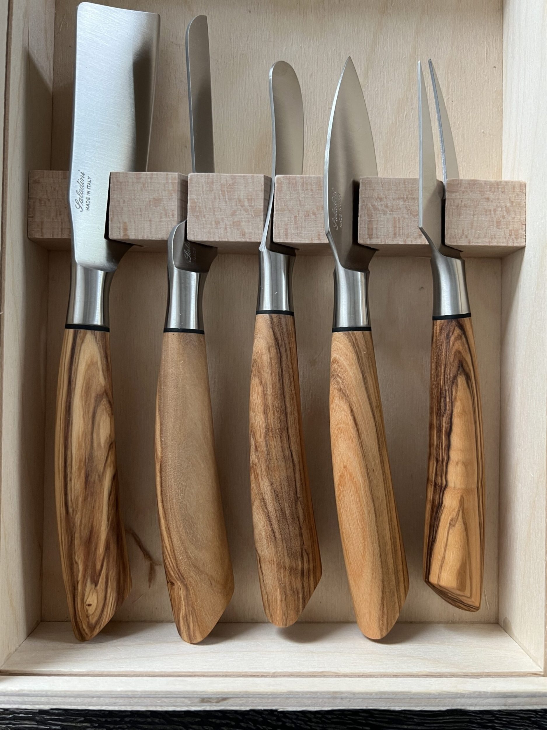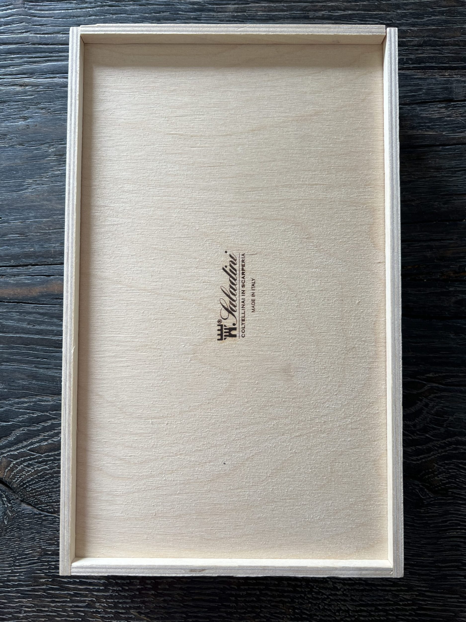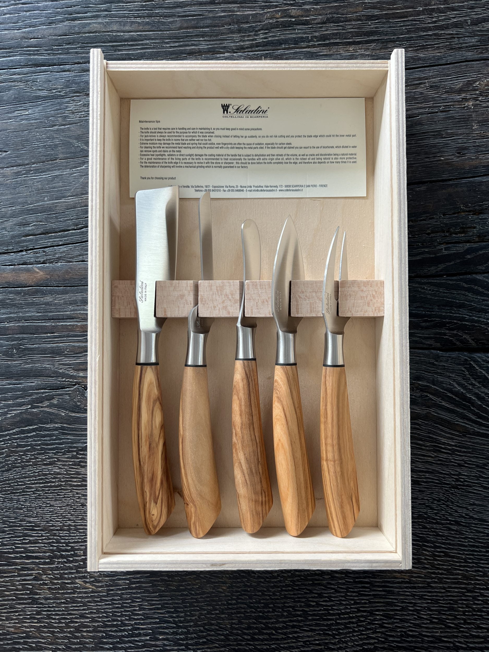 Ostesættet leveres samlet i en enkel trææske. Trææsken er brændemærket med et Saladini logo.