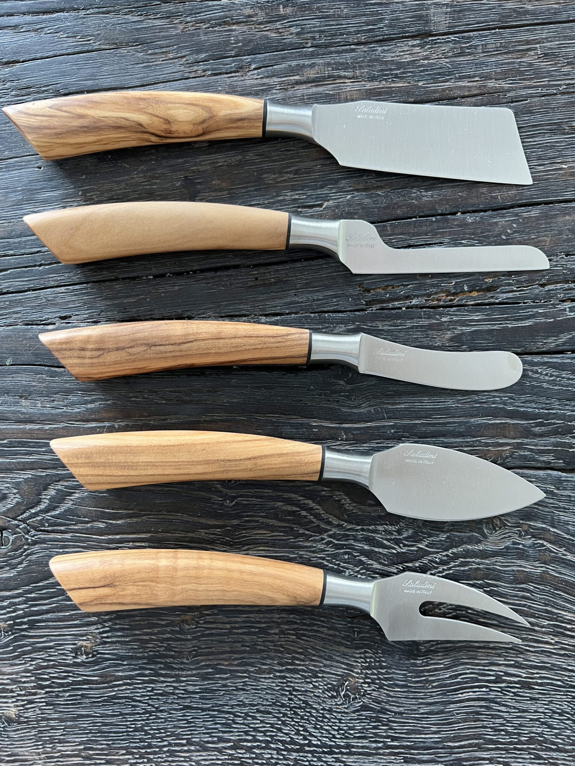 Med det her smukt designet ostesæt fra italienske Saladini, er du klar til det helt store ostebord. Osteknive sættet består af 4 osteknive og en ostegaffel. Hver ostekniv er designet til bestemte ostetyper. Med de her 4 forskellige ostknive, er du helt dækket ind.